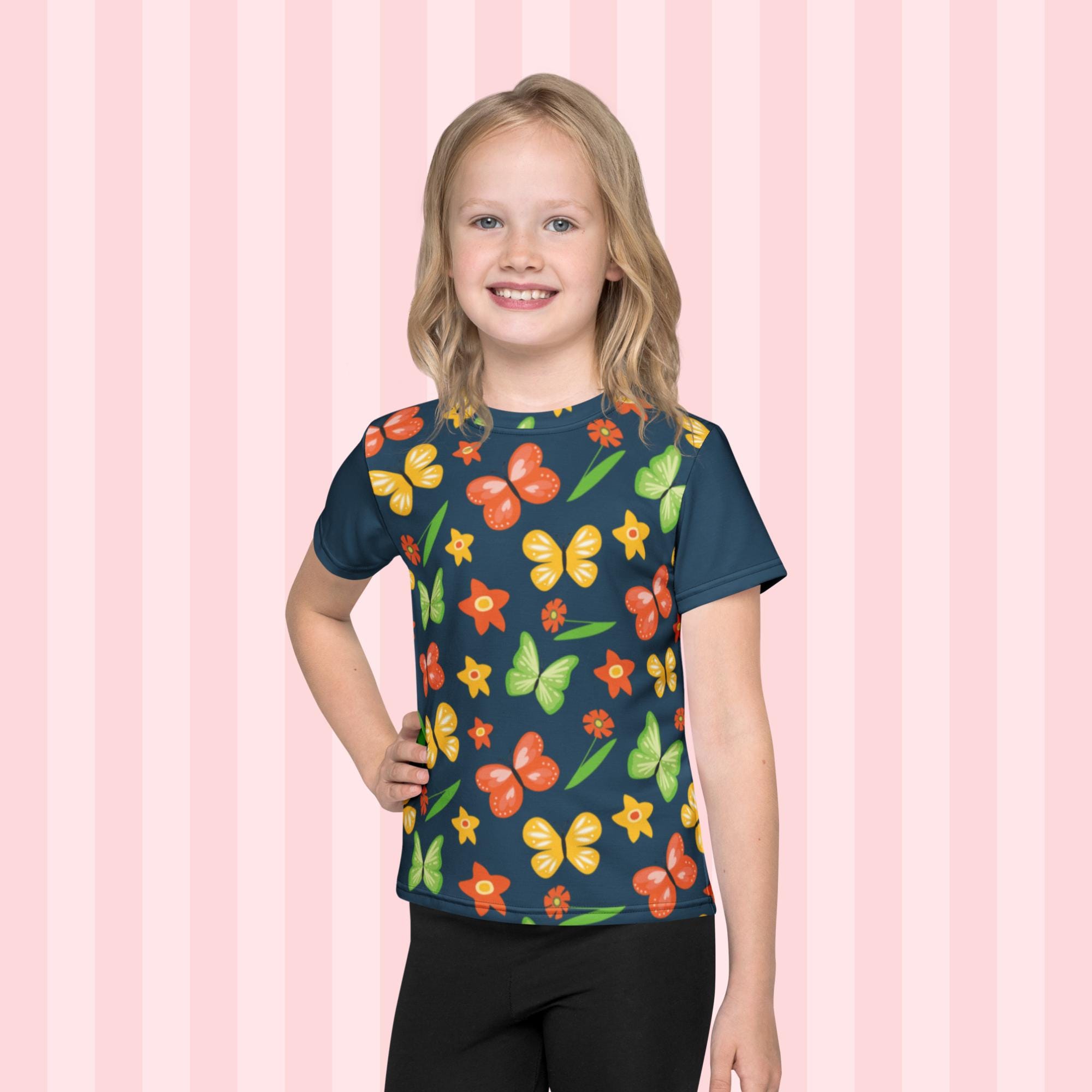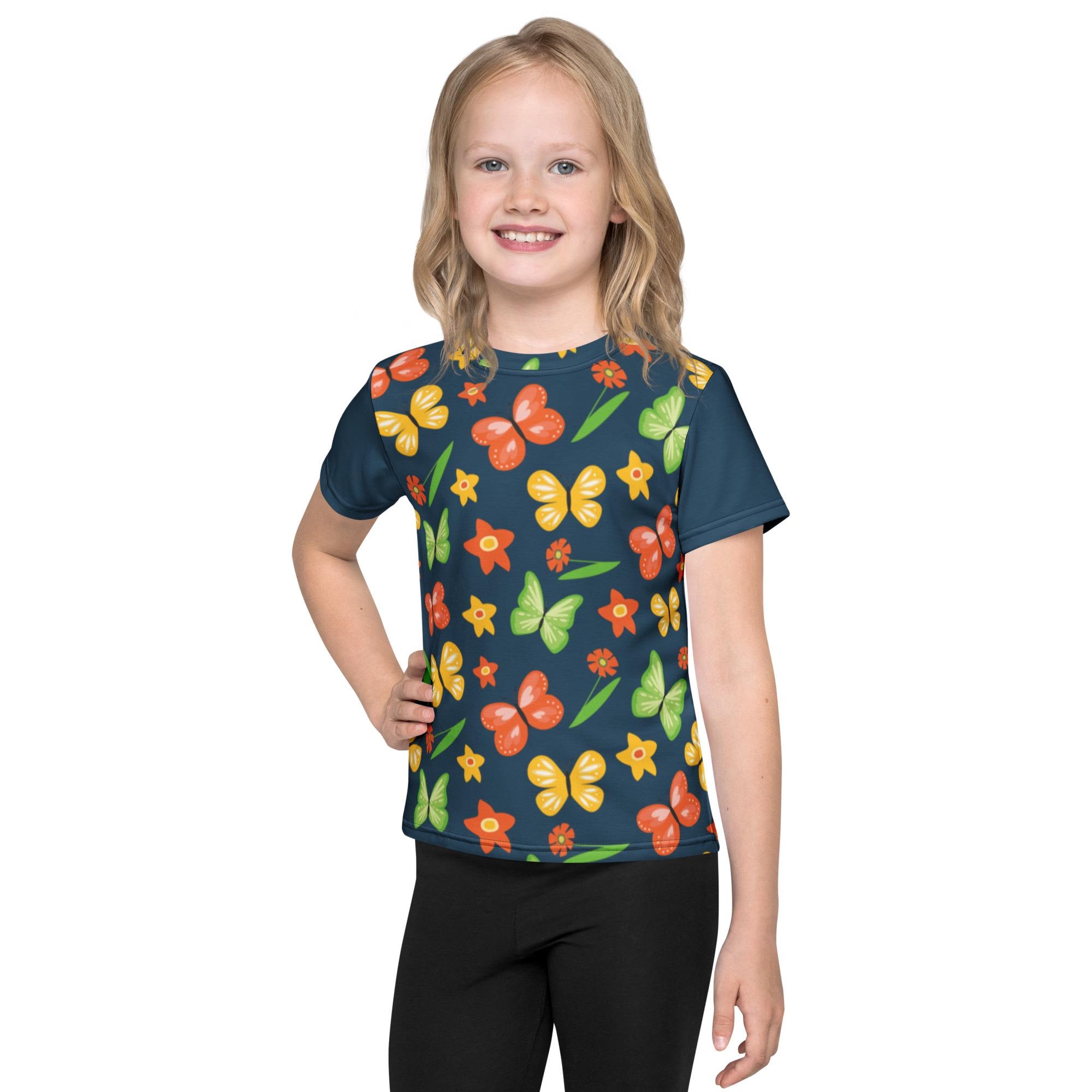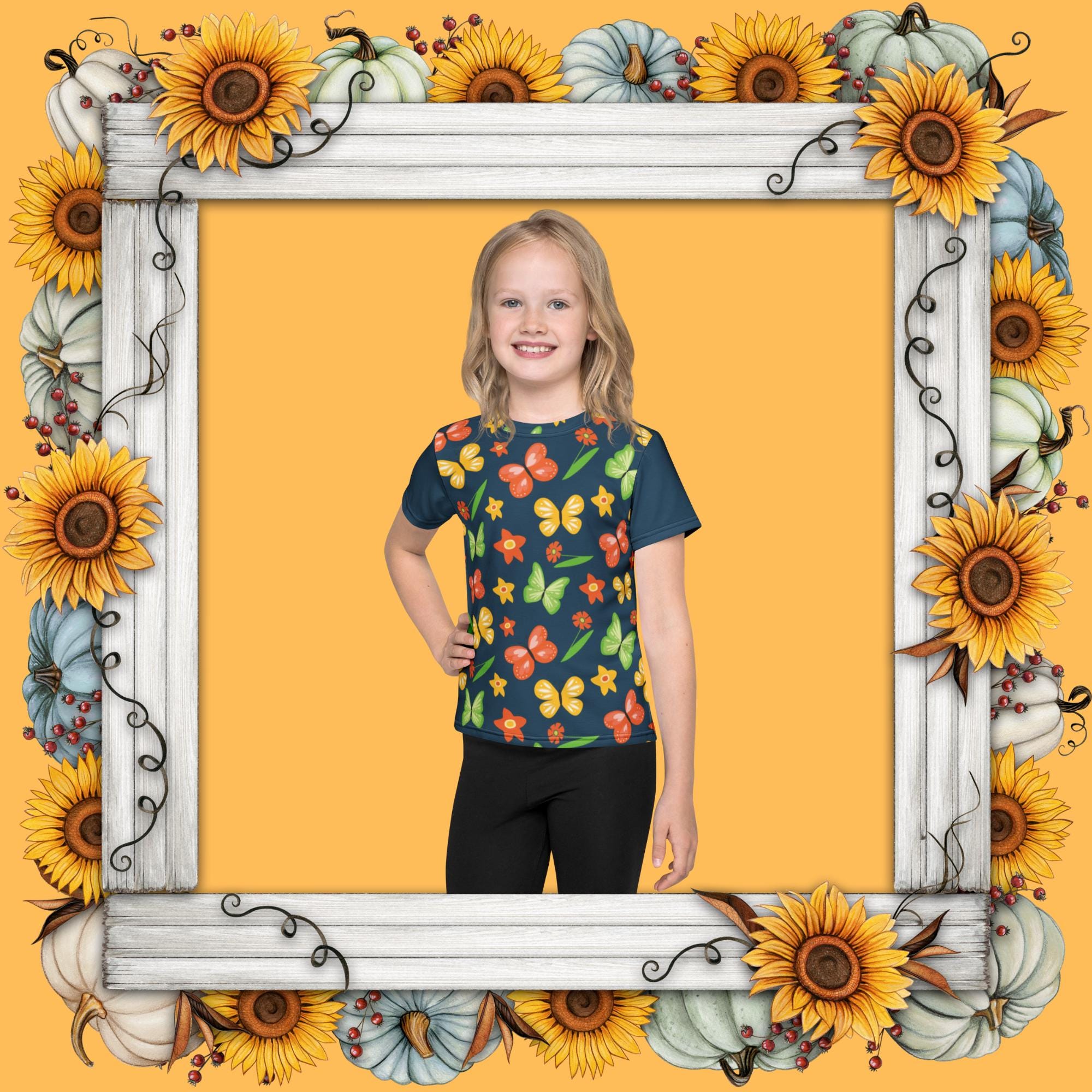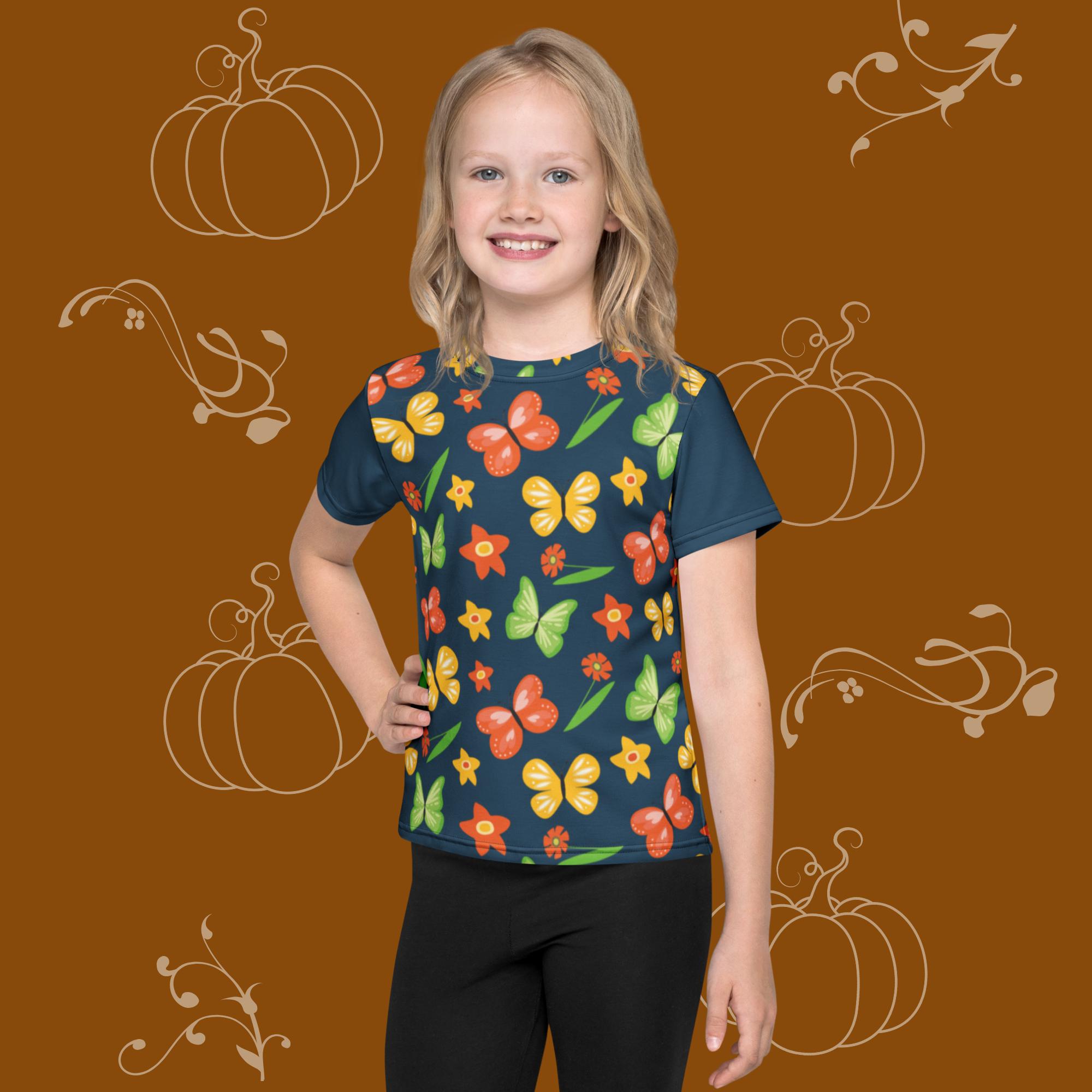 Introducing our delightful kids’ crew neck t-shirt, perfect for little ones who love to stand out! This short sleeve blue tee features a vibrant orange, green, and yellow butterfly and flower design that adds a touch of fun to any outfit. Made from soft, breathable fabric, it ensures all-day comfort for playtime and adventures. Available in various sizes, this shirt makes a fantastic gift for birthdays or just because. Brighten up their wardrobe with this charming and playful piece!