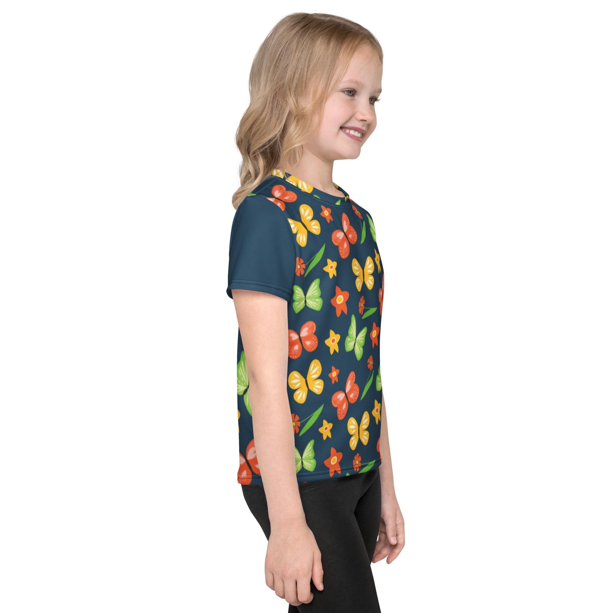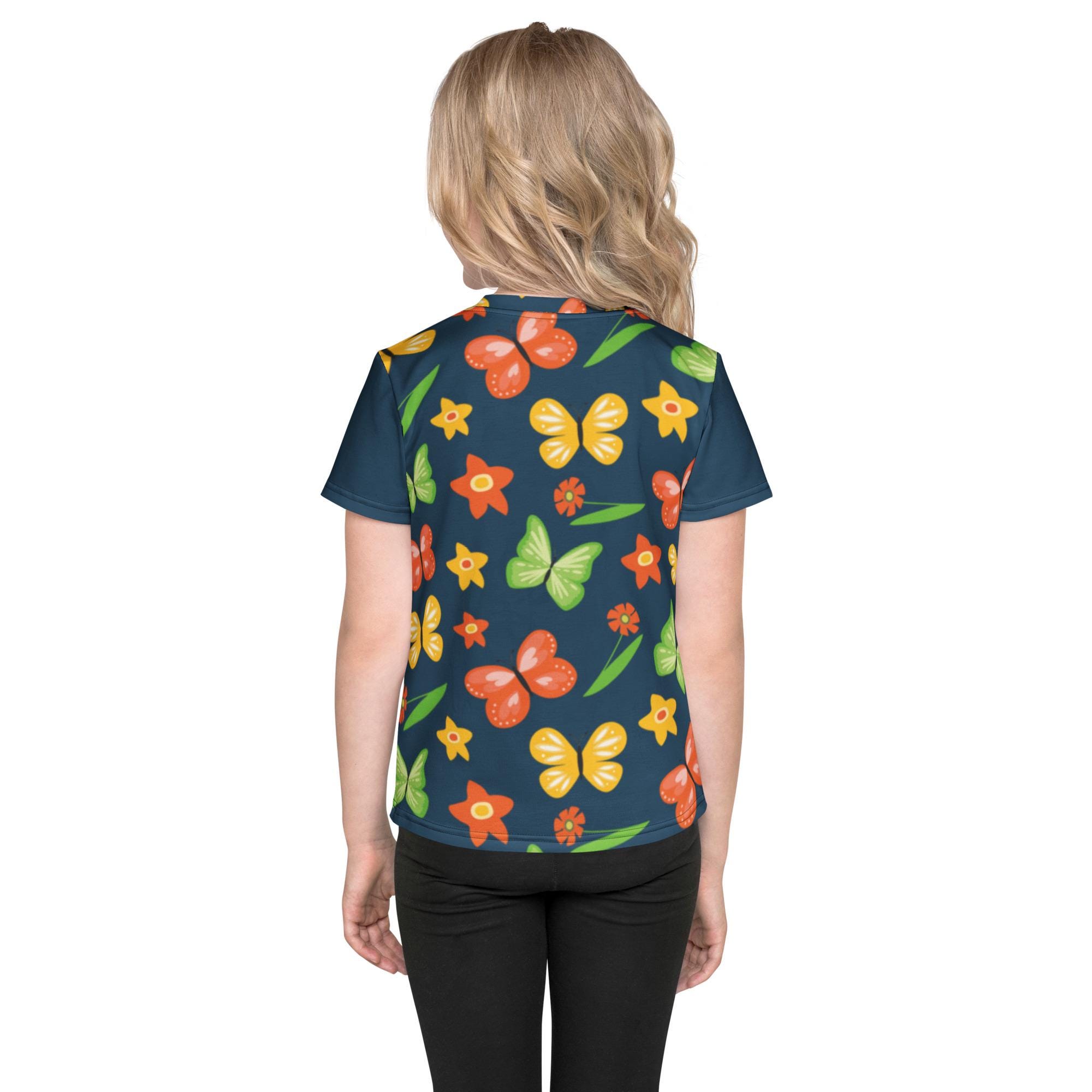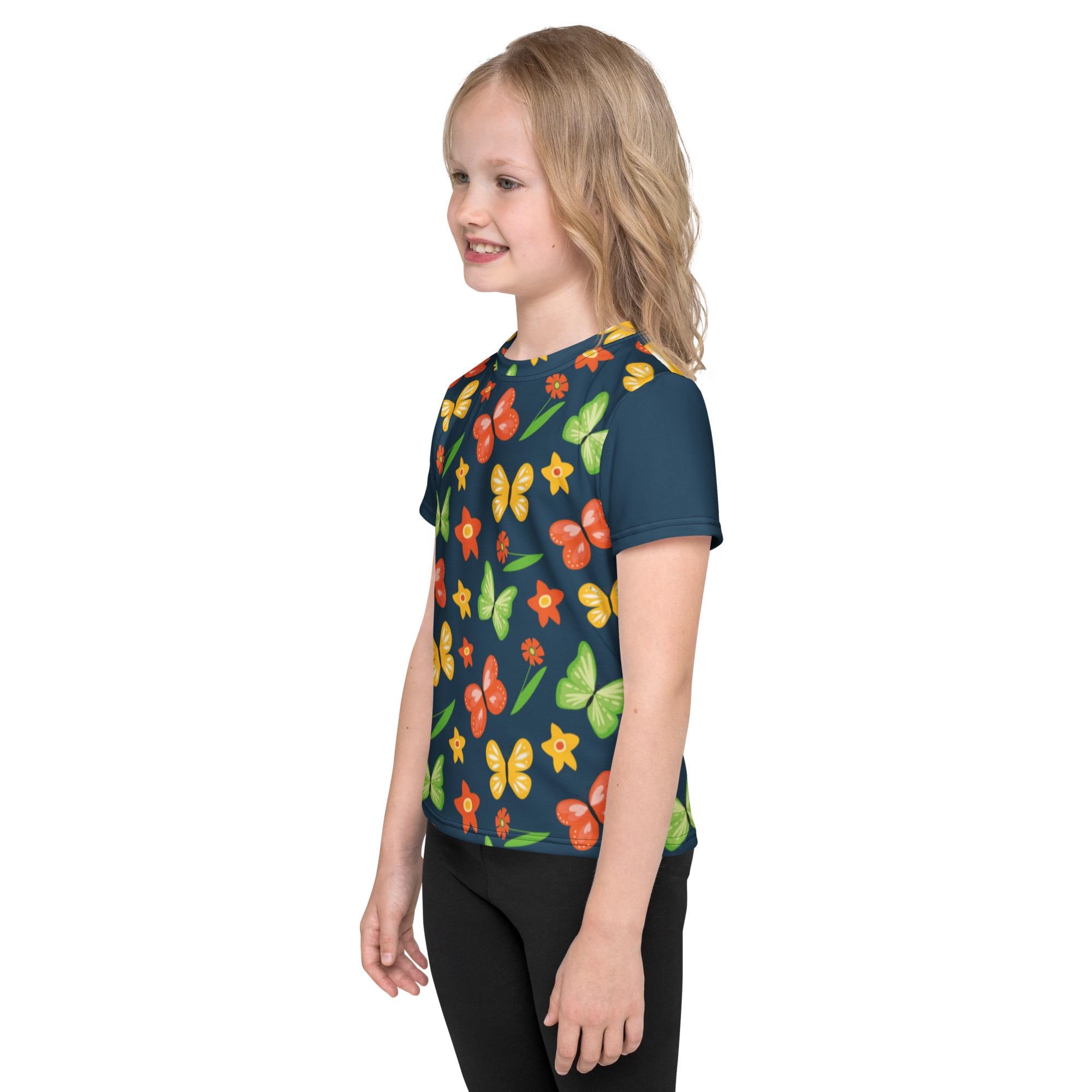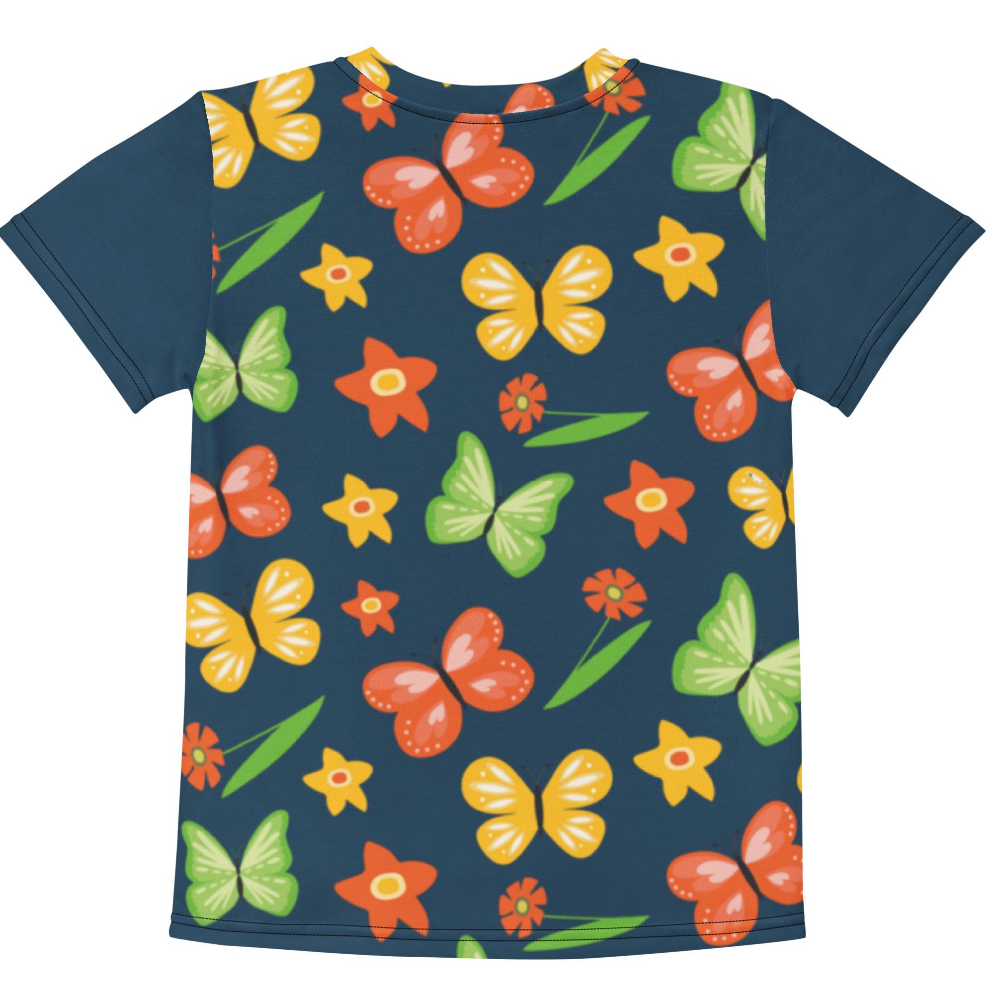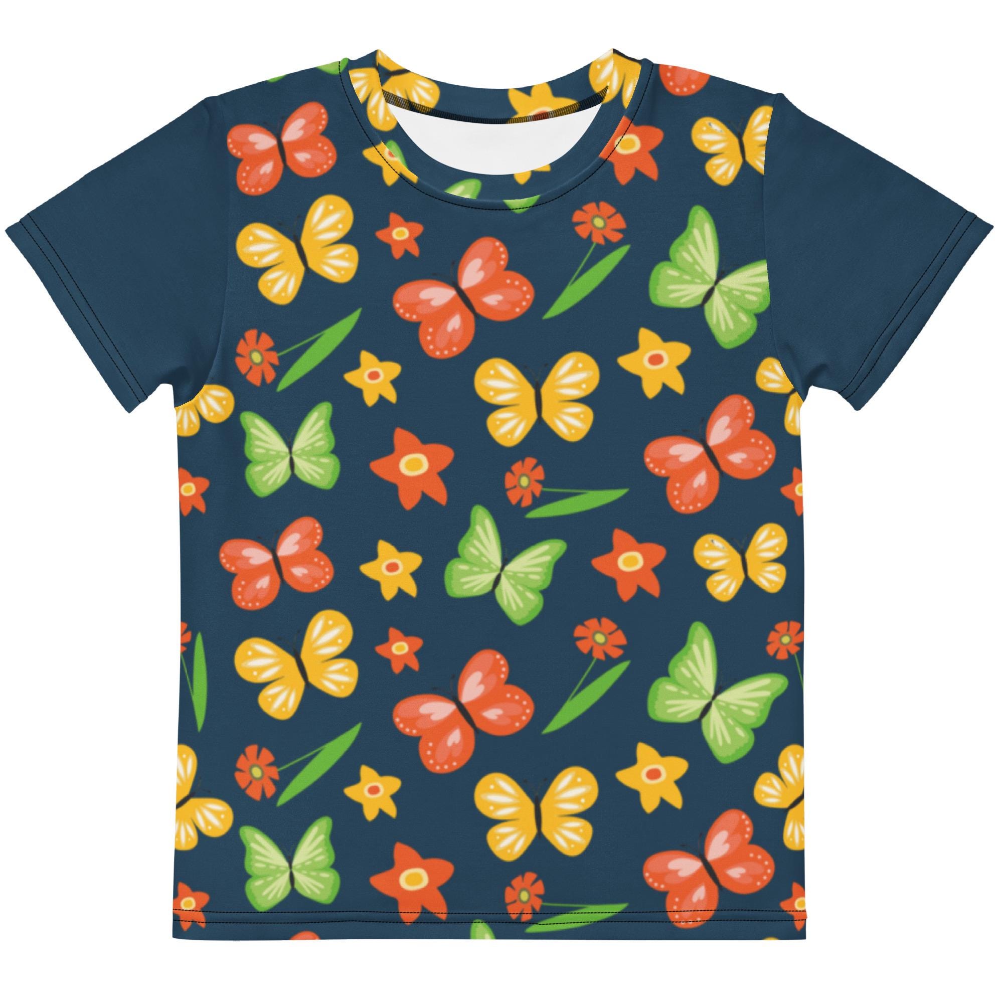 Introducing our delightful kids’ crew neck t-shirt, perfect for little ones who love to stand out! This short sleeve blue tee features a vibrant orange, green, and yellow butterfly and flower design that adds a touch of fun to any outfit. Made from soft, breathable fabric, it ensures all-day comfort for playtime and adventures. Available in various sizes, this shirt makes a fantastic gift for birthdays or just because. Brighten up their wardrobe with this charming and playful piece!