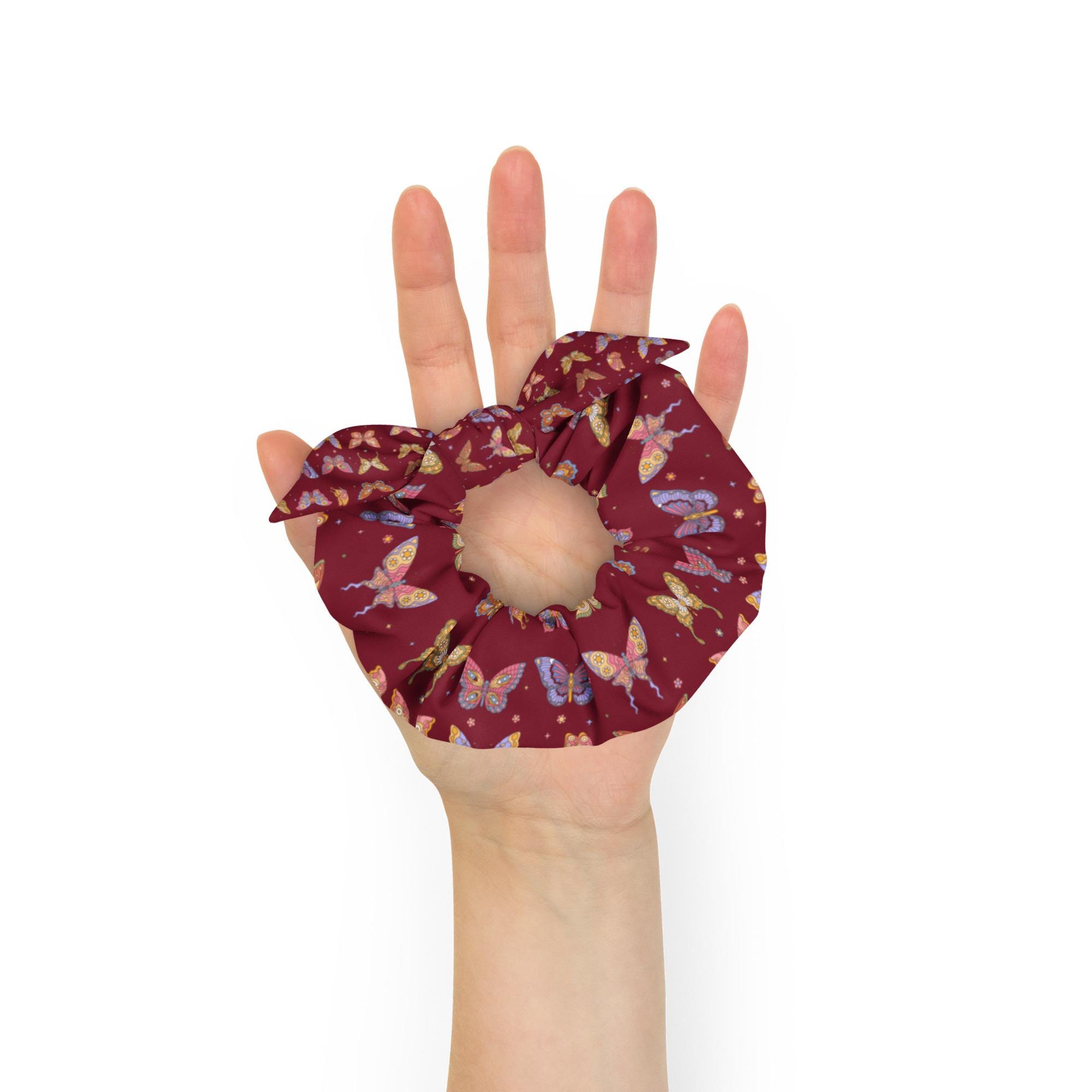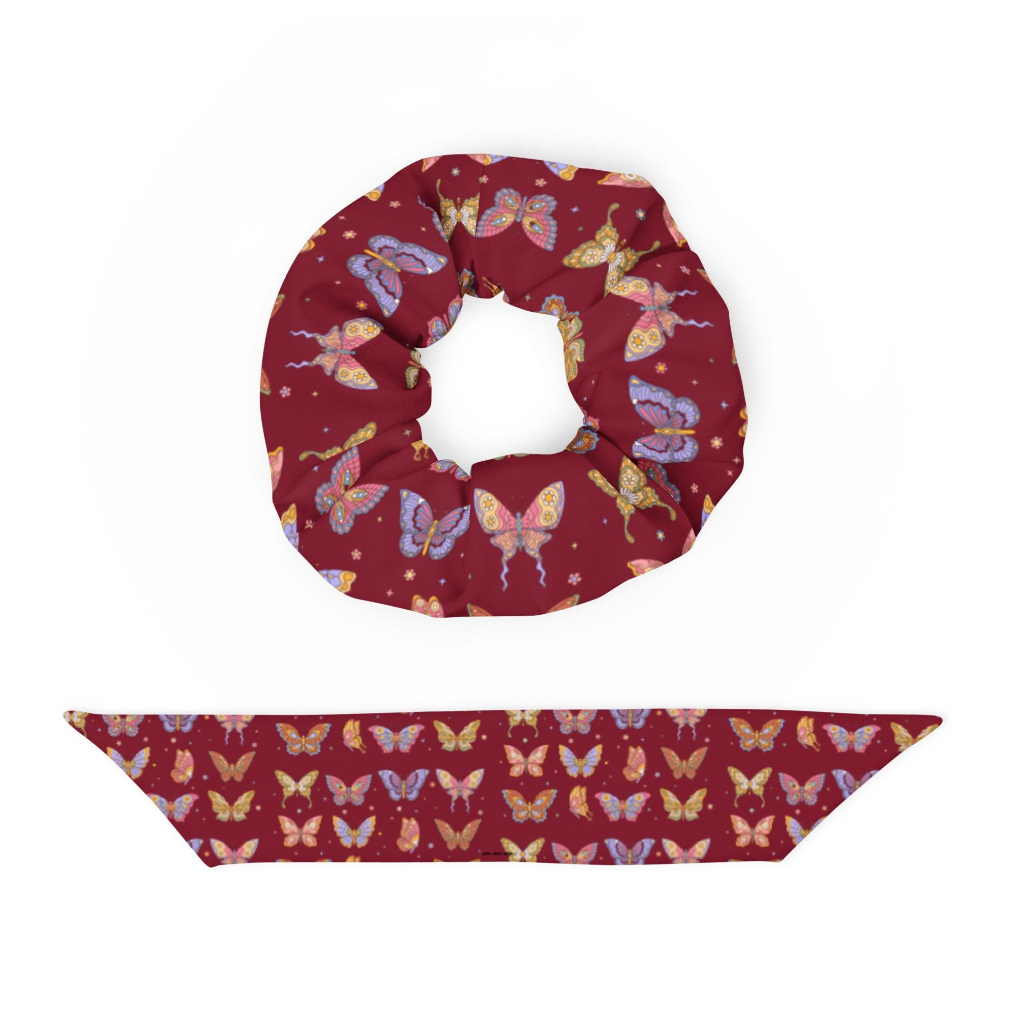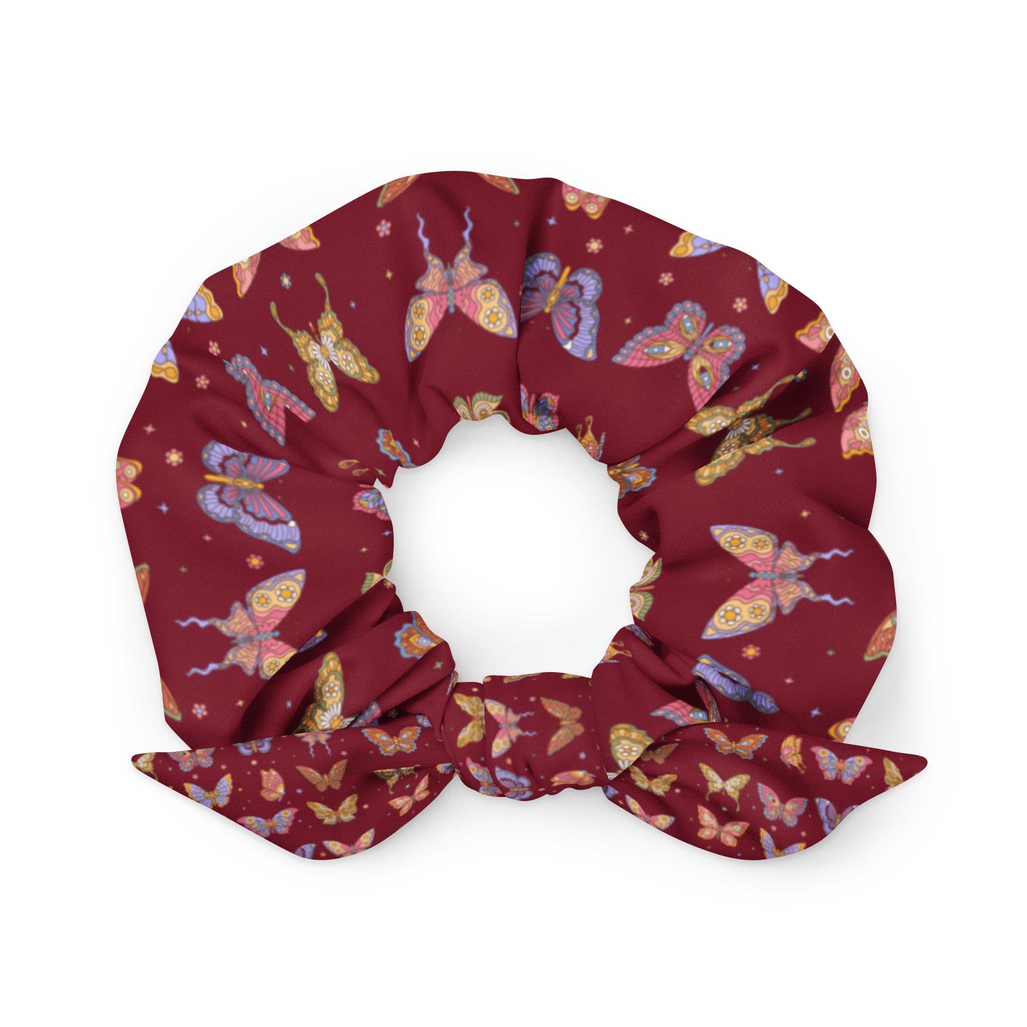 Elevate your accessory game with our Recycled Scrunchie featuring vibrant multi-color butterflies in pink, purple, and yellow set against a rich burgundy background. Made from eco-friendly materials, this scrunchie adds a playful touch to any hairstyle while promoting sustainability. Its gentle hold keeps your hair looking chic without damaging it. Perfect for casual days or special occasions! Add a pop of color to your look and embrace eco-conscious fashion with this must-have accessory.