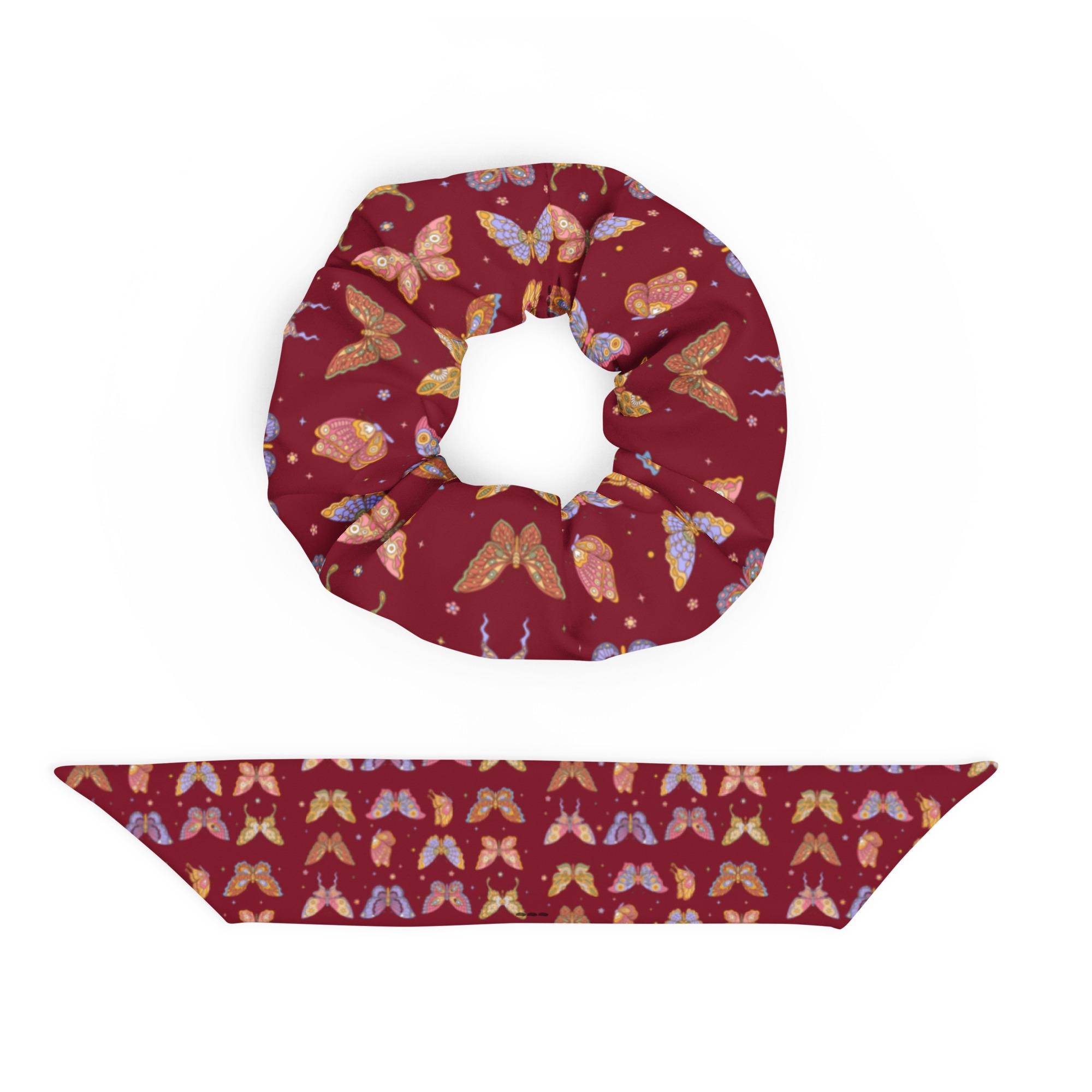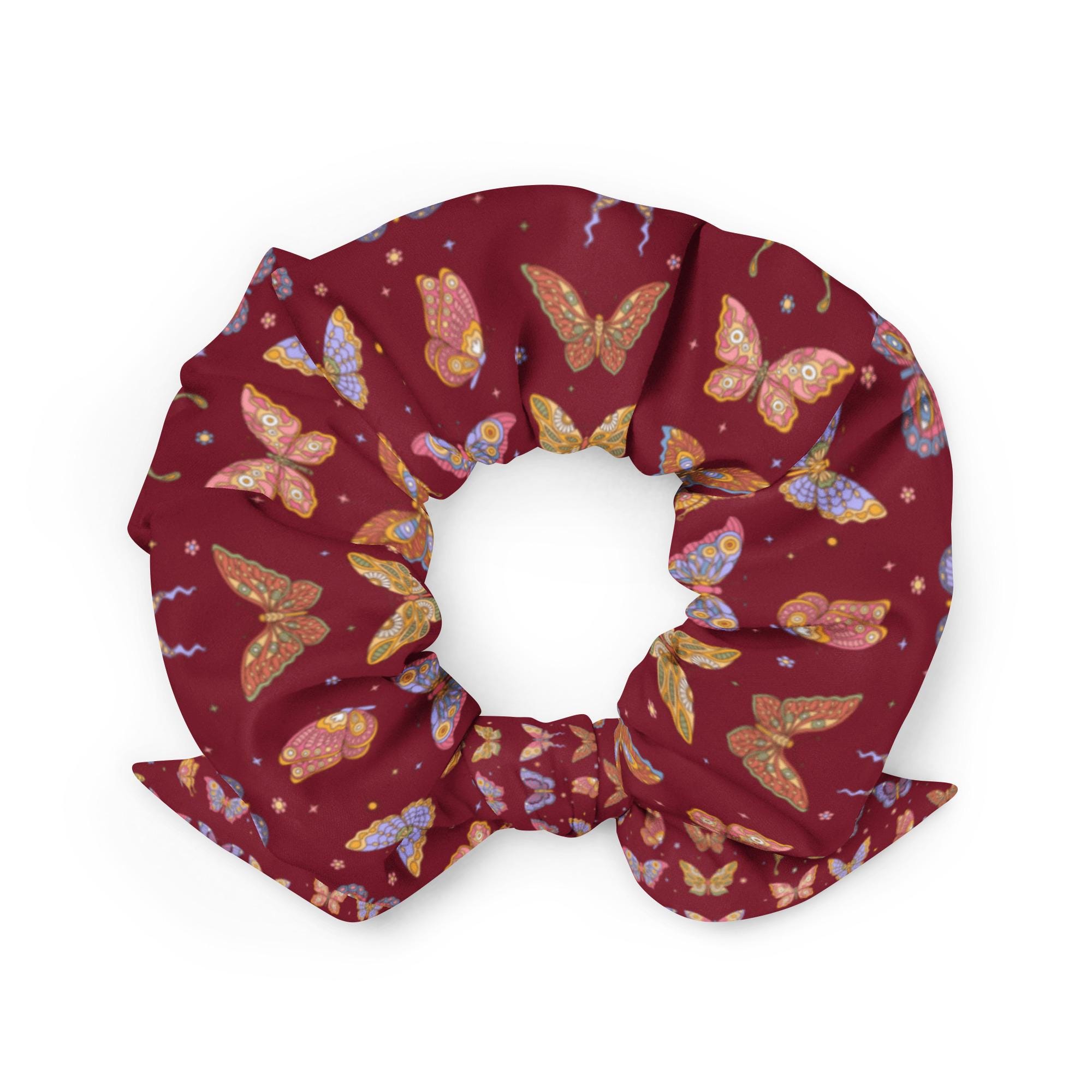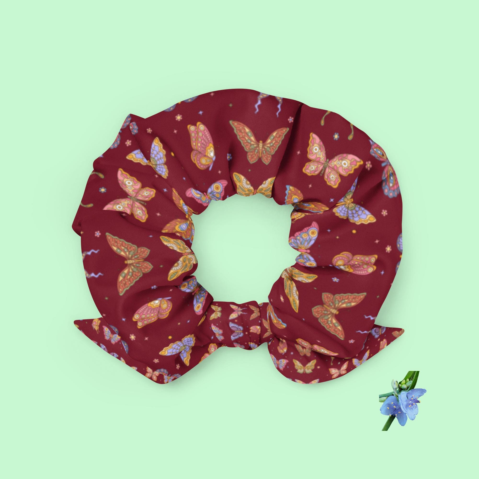 Elevate your accessory game with our Recycled Scrunchie featuring vibrant multi-color butterflies in pink, purple, and yellow set against a rich burgundy background. Made from eco-friendly materials, this scrunchie adds a playful touch to any hairstyle while promoting sustainability. Its gentle hold keeps your hair looking chic without damaging it. Perfect for casual days or special occasions! Add a pop of color to your look and embrace eco-conscious fashion with this must-have accessory.