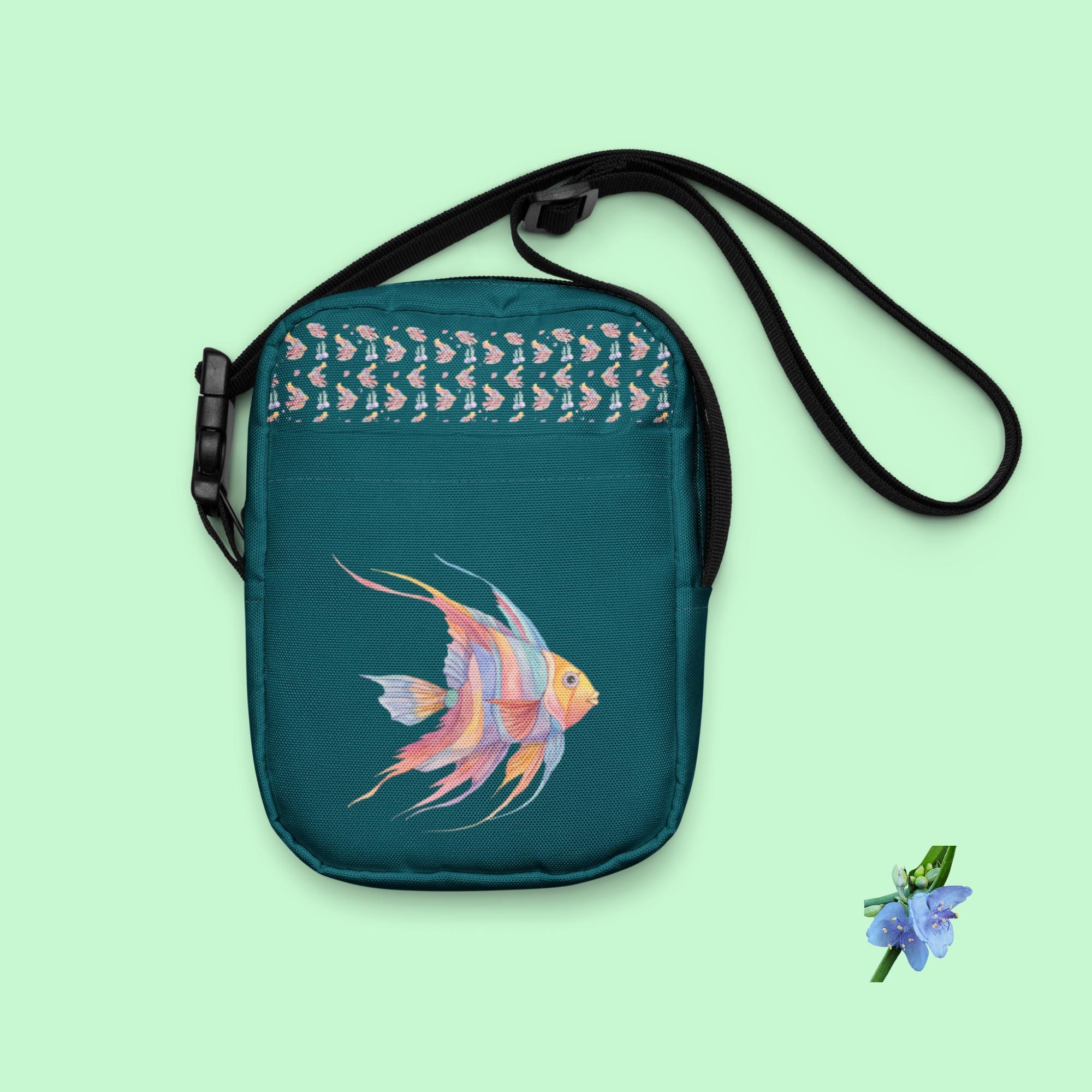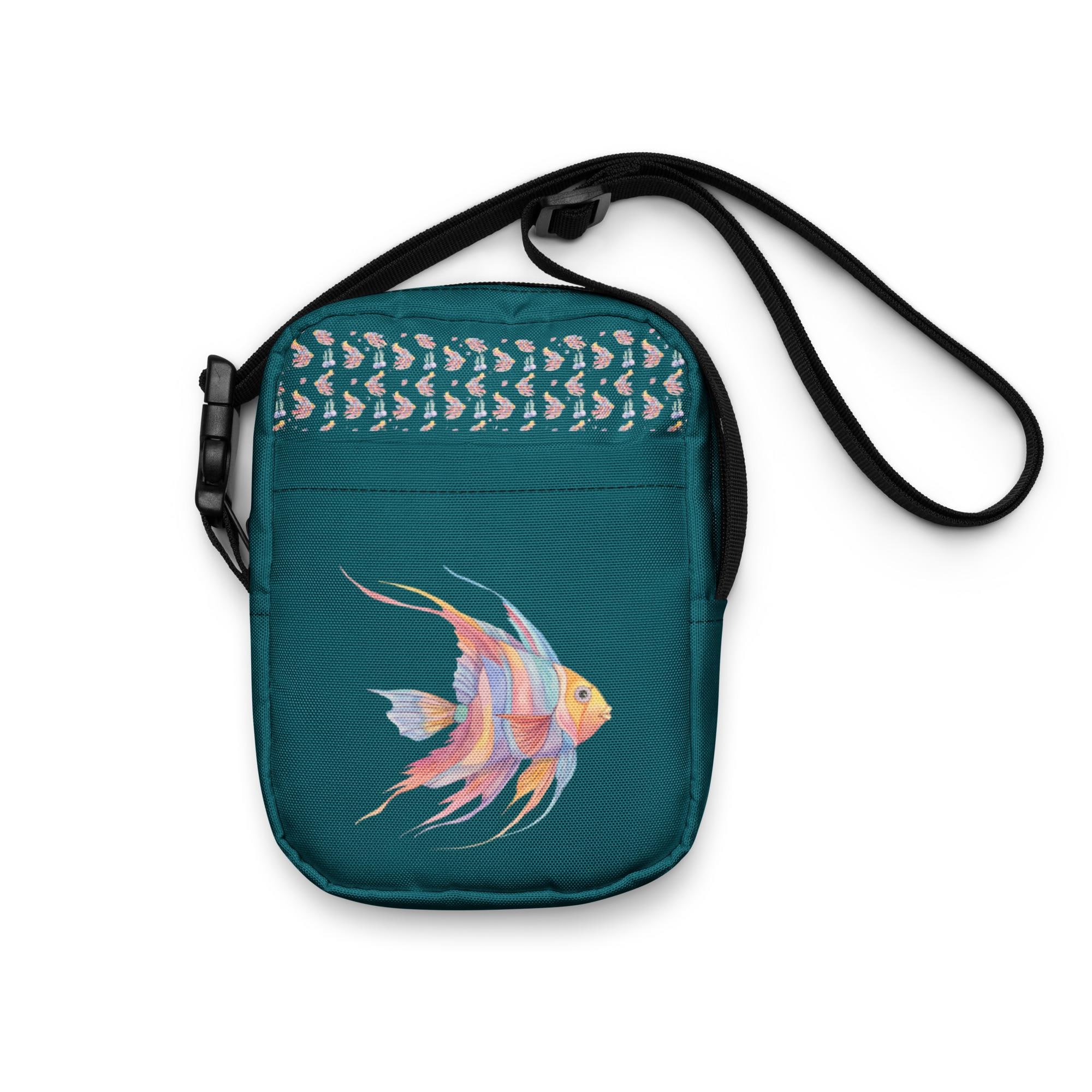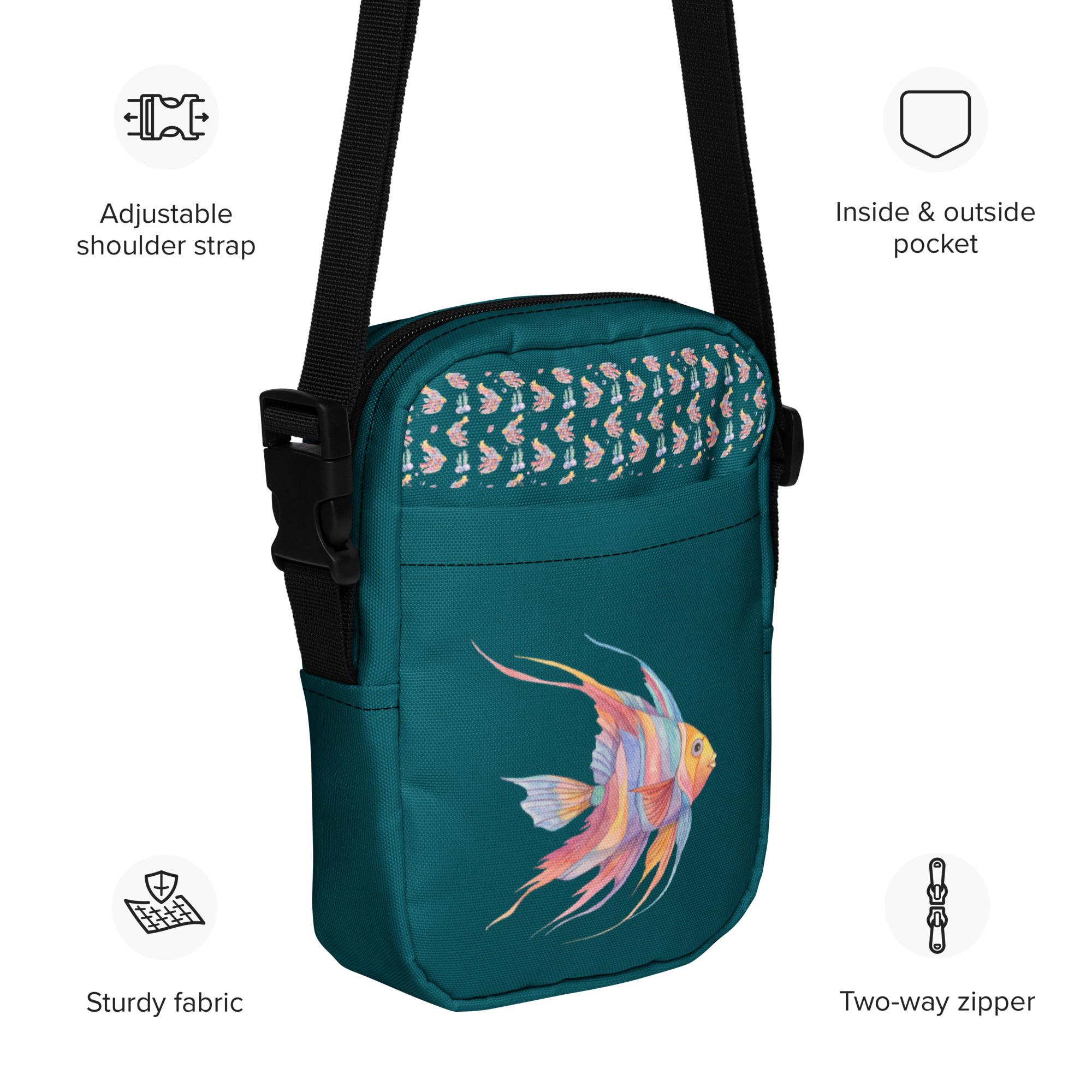 Elevate your style with our Utility Crossbody Bag in a captivating green-blue, featuring a stunning watercolor angelfish design in vibrant blues, yellows, pinks, and purples. Perfect for hands-free convenience, this functional yet stylish bag is ideal for everyday outings or special occasions. The unique artwork adds a splash of color to your ensemble while keeping your essentials secure. Lightweight and spacious, it's a must-have accessory for any fish lover or art enthusiast! Grab yours today!