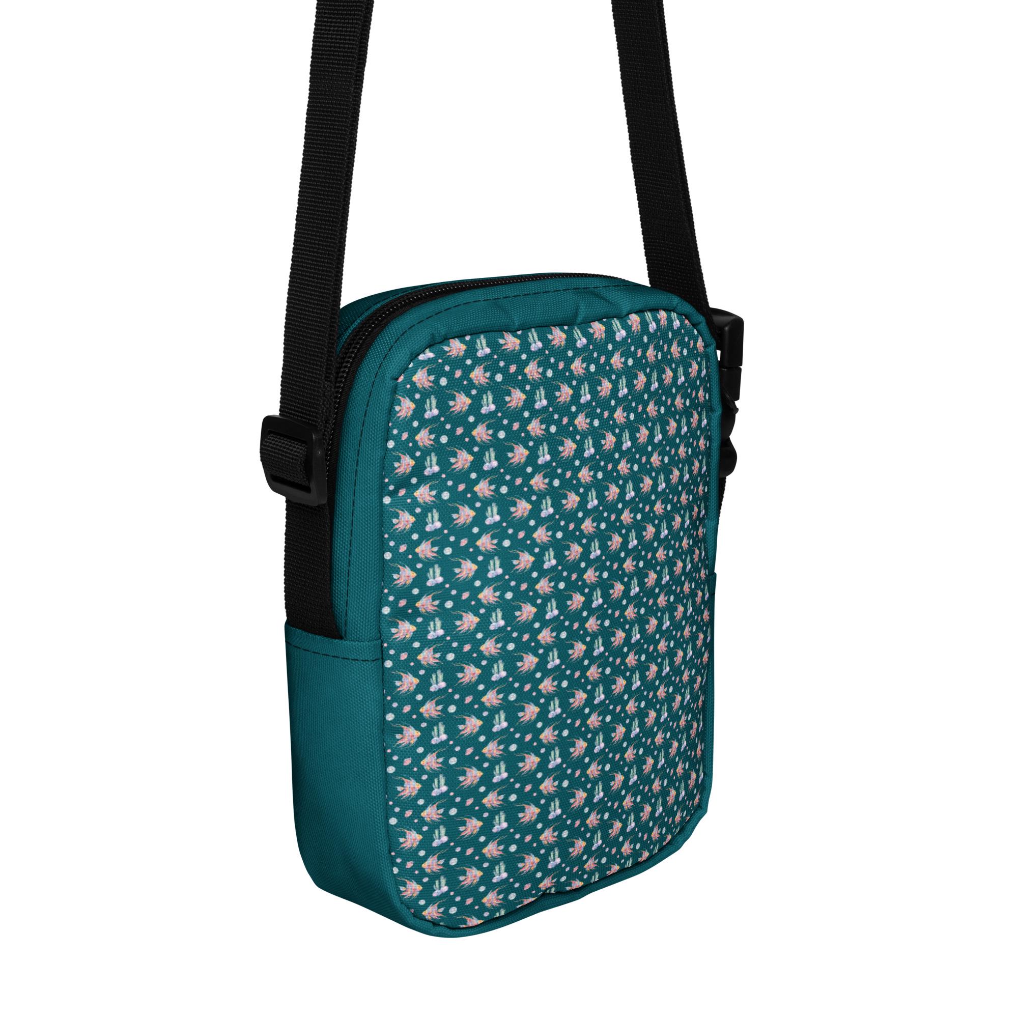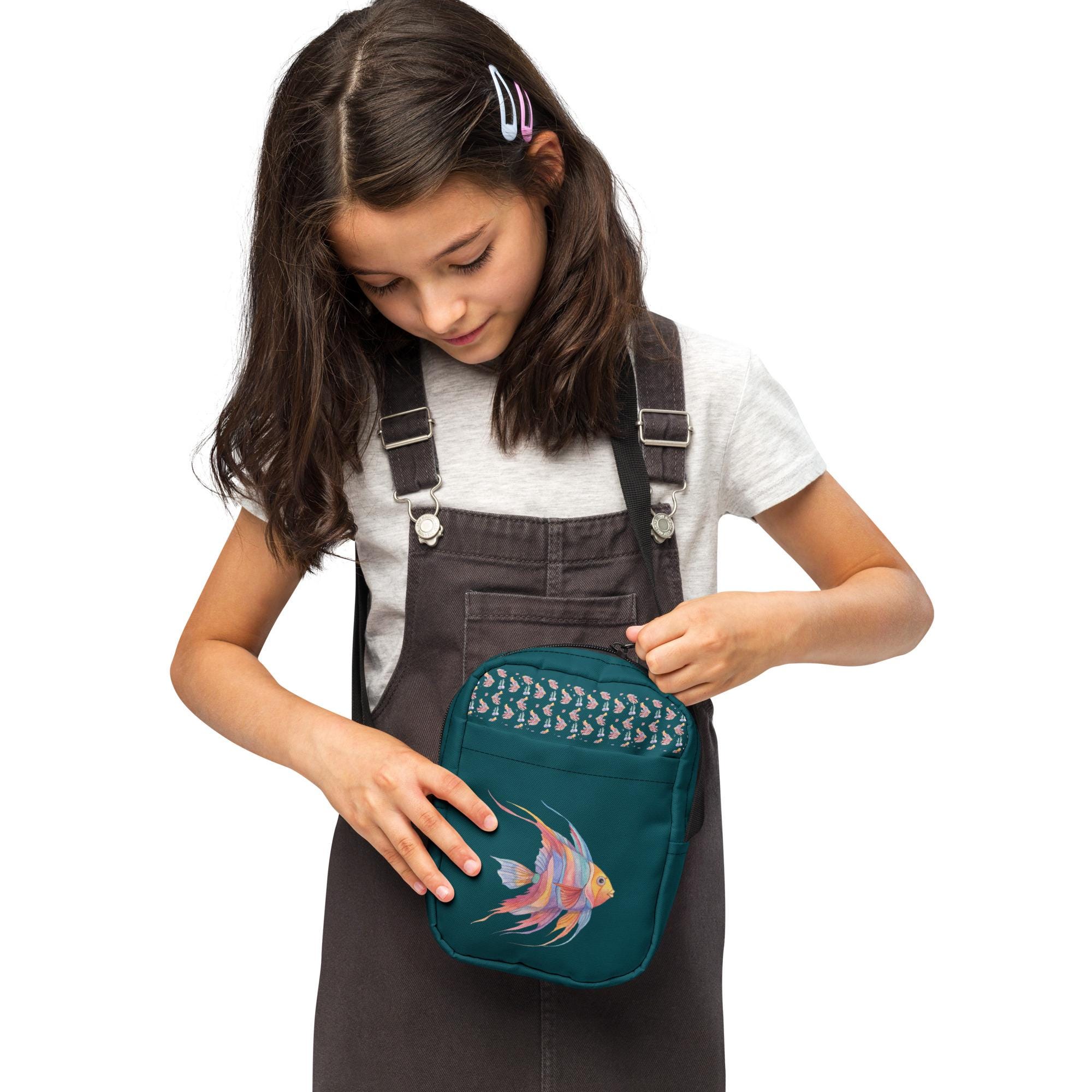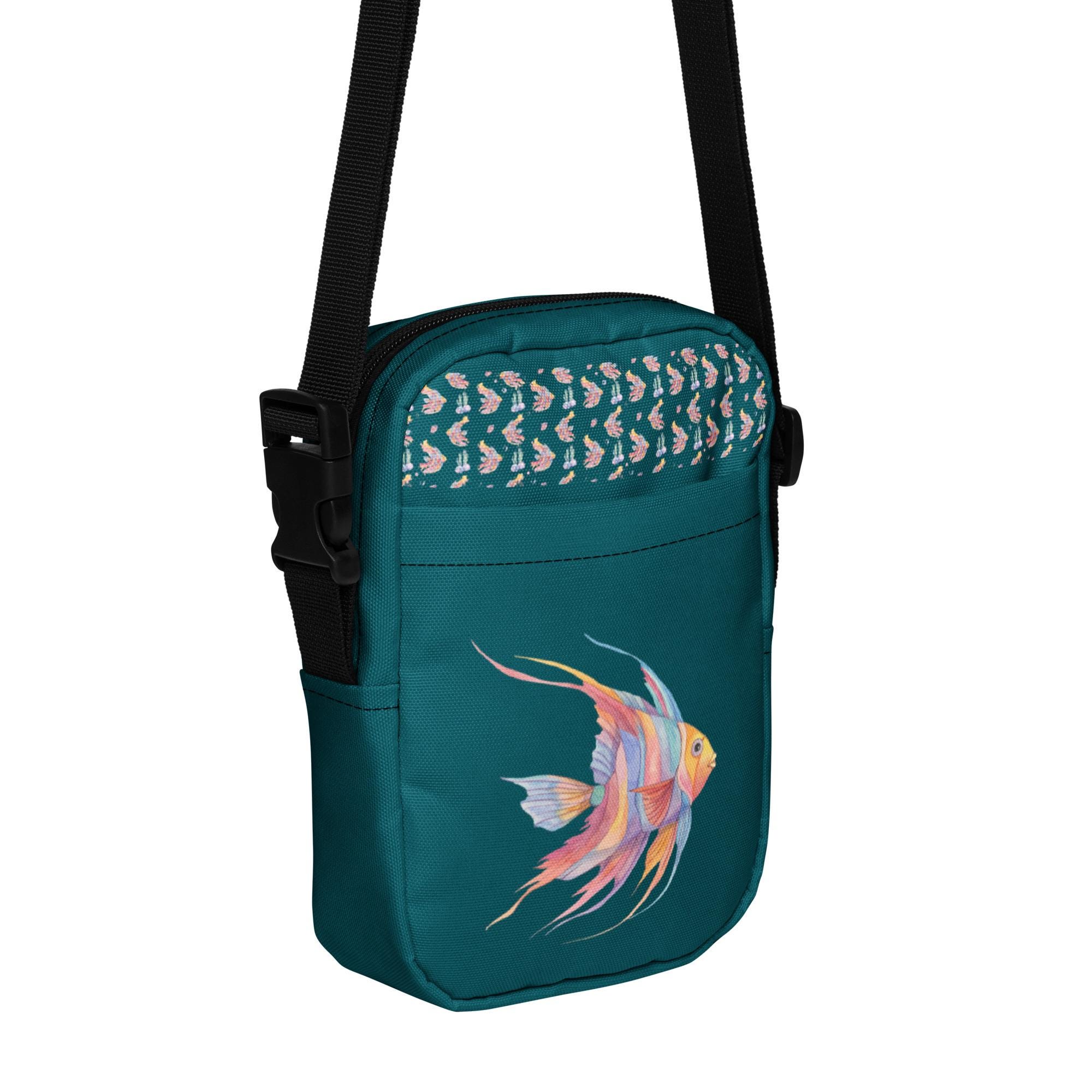 Elevate your style with our Utility Crossbody Bag in a captivating green-blue, featuring a stunning watercolor angelfish design in vibrant blues, yellows, pinks, and purples. Perfect for hands-free convenience, this functional yet stylish bag is ideal for everyday outings or special occasions. The unique artwork adds a splash of color to your ensemble while keeping your essentials secure. Lightweight and spacious, it's a must-have accessory for any fish lover or art enthusiast! Grab yours today!